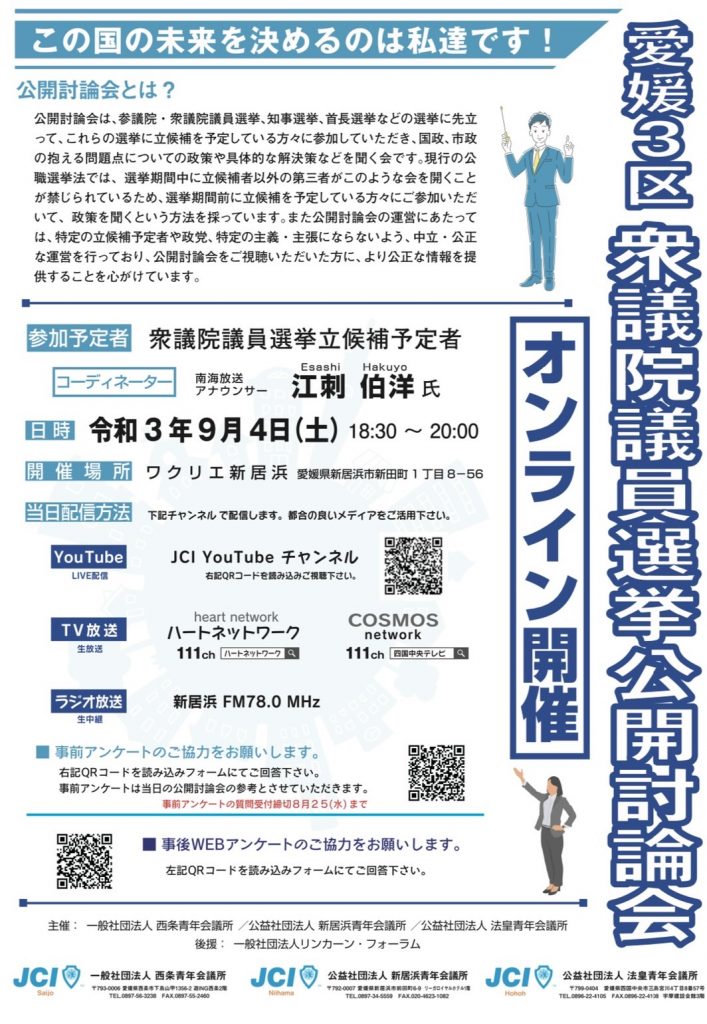 事業告知 「愛媛3区 衆議院議員選挙 公開討論会」 2021年9月4日 2021年9月4日 23秒 Facebook Twitter はてブ Pocket Feedly 9月4日(土)18:30から行います。 是非ご視聴いただき、事後webアンケートにご回答ください。 ただいまリハーサル中。18時半開始です! 是非ご視聴ください! https://m.youtube.com/channel/UCE0zXvqEcxOmf-H3lfPfgWg Facebook Twitter はてブ Pocket Feedly